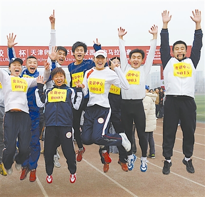12月24日,参赛师生庆祝抵达终点。当日,天津师范大学举行“校友杯”首届校园迷你马拉松赛,全校近3000名师生参加了竞赛组和健身组的比赛。新华社记者 杨宗友 摄
