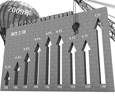 国家统计局对2009年房地产市场的监测报告表明,从今年5月份开始,楼市在“反弹”、“回暖”中骤然升温,随后房价一路狂飙。11月份,全国70个大中城市房屋销售价格同比上涨5.7%,涨幅比10月份扩大1.8个百分点。新建住宅销售价格同比上涨6.2%,涨幅比10月份扩大2.2个百分点。在一线城市,相比年初,很多楼盘的成交价格均已翻了一番。