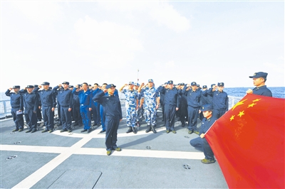 12月26日,在亚丁湾执行护航任务的中国海军护航编队“马鞍山”舰上,护航官兵向国旗庄严宣誓。当天,中国海军护航编队官兵在“马鞍山”舰上举行多种活动,纪念中国海军在亚丁湾、索马里海域执行护航任务一周年,以表达护航官兵对党和人民的无限忠诚和完成任务的坚强决心。新华社记者 杨志刚 摄