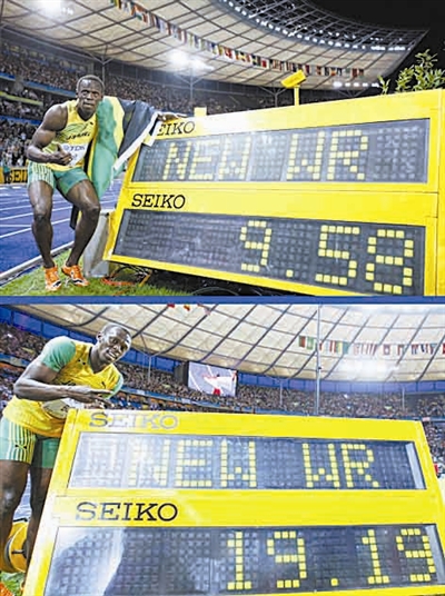 8月16日,在德国柏林举行的世界田径锦标赛男子100米决赛中,牙买加选手博尔特以9秒58的成绩夺冠并同时打破了他在北京奥运会上创造的9秒69的世界纪录。8月20日,他又在该项赛事的男子200米决赛中以19秒19的成绩夺冠并刷新了自己在北京奥运会上创下的19秒30的世界纪录。