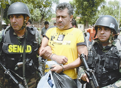 12月27日,全副武装的巴拉圭军警将巴西毒枭西梅内斯·帕冯(中)带往首都亚松森关押。帕冯在巴西和巴拉圭等南美国家操纵一个庞大的国际走私毒品集团,是巴拉圭警方通缉的头号毒枭。