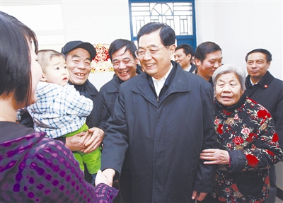 听说总书记来到村里,欣喜的村民纷纷拥到路边。胡锦涛走到乡亲们中间,向大家问候新年。