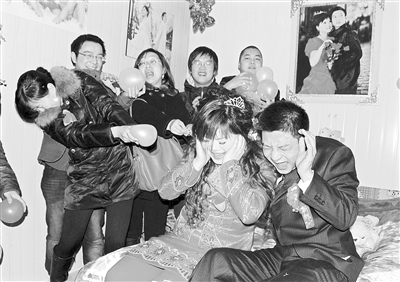 2010年1月1日晚上,中铁二局物资公司成都分公司的工友们正在京沪高速铁路山东曲阜轨道板场的板房里闹洞房。因为上午还要生产,婚礼只好推迟到晚上进行。来自中铁二局京沪指挥部、物资公司成都分公司、新运公司曲阜轨道板场的100多名领导、员工在祝福新人的同时迎接2010年的到来。廖金文 摄
