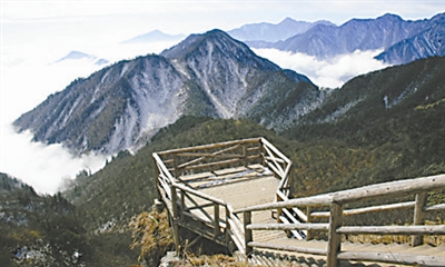 站在护栏边,眼前云海茫茫,仿佛仙人已腾云驾雾,风拂衣抖,飞了起来。云海不断变幻、翻腾,远处高耸的雪山如飘渺的仙岛,令人神往。