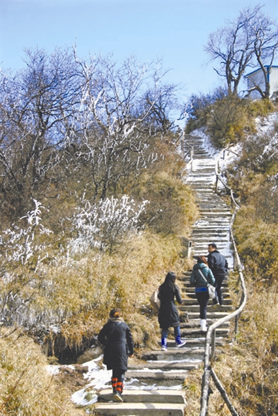西岭雪山的日月坪,在这里常见日月同辉而得名。极目远眺,群山银装素裹,几朵棉絮般的白云从雪峰上掠过,使天空显得格外宽广。山窝里几缕淡淡的雪雾缓缓升腾,在半山腰萦绕飘荡,宛如一条洁白的哈达挂在仙女的脖子上。再往近处俯瞰,只见那干枯的树枝上,雪花落势千姿百态,有的像朵朵棉球,有的像毛茸茸、亮晶晶的银朵。
