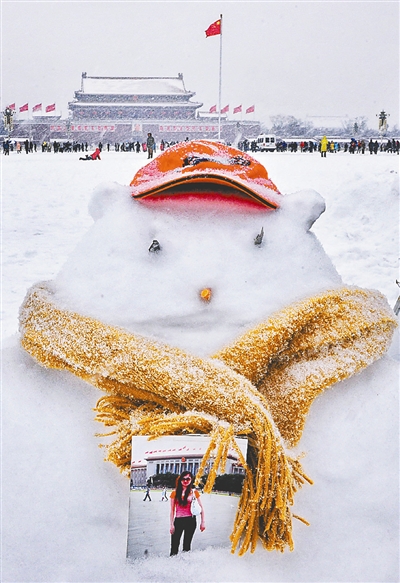 1月3日上午,天安门广场上的摄影摊位特意堆起了雪人以吸引顾客。