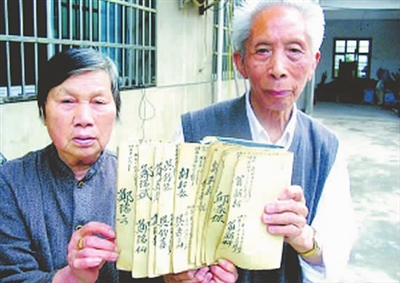 从1942年至2008年,郑宜栋67年履行债务人的义务,终于将全部欠债还清。图为郑老伯和他的老伴儿手持67年前父亲留下的欠债账簿。