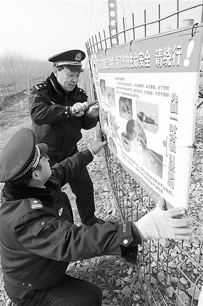 春运来临,徐州铁路公安处在管内近600公里线路上开展“线路治安集中整治”行动,组织民警通过徒步巡线、联合检查等方式对线路护栏网破损、容易被盗的铁路设施等进行细致检查,目前已对129处隐患进行了及时整改,在65处重要位置、重点区段设立了安全提示牌。图为民警正在陇海线187公里处的重要位置对安全提示牌进行加固。