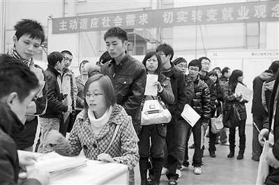 重庆2010届普通高校毕业生就业双选活动日前在陈家坪重庆展览中心举行。重庆建工、娃哈哈、力帆实业、嘉陵工业、宗申发动机等90余家用人单位提供了3000余个就业岗位,主要涉及机械制造、食品加工、电子科技、金融保险、服务管理等,吸引了4000多名毕业生进场应聘。 渝钟 摄