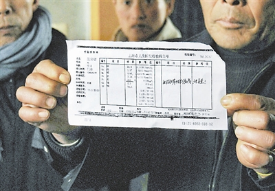 1月3日,村民拿出孩子血铅超标的医院检查单。江苏大丰市政府当日通报了该市经济开发区河口村51名儿童血铅超标调查处理情况,经调研论证河口村部分儿童血铅浓度超标尤其是超标严重者,与盛翔电源有限公司含铅污染物排放总量增加和职工铅防意识不到位有着密切关系。目前,血铅超标儿童已经得到妥善安置和治疗。李菲 摄