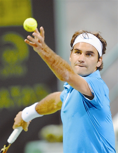 1月5日,瑞士选手费德勒在比赛中发球。当日,在多哈举行的2010年ATP世界巡回赛卡塔尔网球公开赛首轮比赛中,费德勒以2比0战胜比利时选手罗胡斯,晋级下一轮。