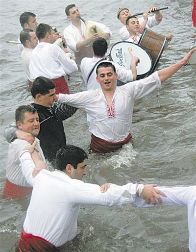 1月6日,在保加利亚卡洛菲尔市,人们在冰冷的河水中跳起保加利亚民间舞蹈霍洛舞,相互祝福在新的一年里身体健康,事事顺遂。 新华社发(维尔科·安格洛夫摄)