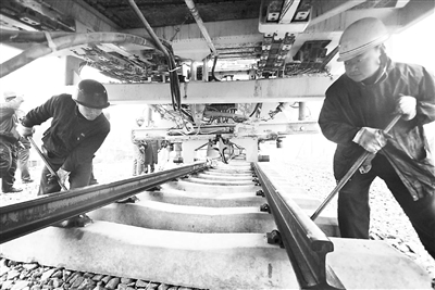 1月4日,施工人员正在庐山火车站用铺轨机为昌九城际铁路进行铺轨。当日,昌九城际铁路全线顺利铺通。国家铁路重点建设项目南昌至九江城际铁路新建线路正线全长92.126公里,设计时速250公里,是我国继京津城际铁路之后开工的第二条城际快速铁路。胡国林 摄