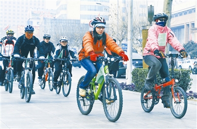 1月9日,参加活动的志愿者在济南泉城路上骑行。当日,近200名济南市民和志愿者举行“2010自行车济南城市总动员”活动,倡导低碳出行方式,让城市生活更加美好。新华社记者 朱峥 摄