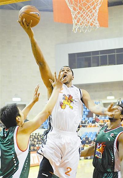 山西队球员泰勒(中)在比赛中上篮。 新华社记者 燕雁 摄