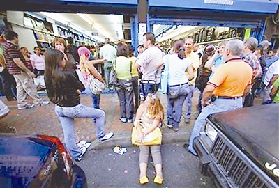 委内瑞拉总统查韦斯8日晚宣布,委内瑞拉货币玻利瓦尔对美元汇率从11日起贬值。这是委内瑞拉自2005年以来首次施行本币贬值。图为1月9日在首都卡拉卡斯,居民们涌进一家电子商店,乘本币贬值前“疯狂”购物。肖劼 供图