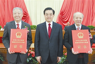 1月11日,2009年度国家科学技术奖励大会在北京人民大会堂隆重举行。中共中央总书记、国家主席、中央军委主席胡锦涛向获得2009年度国家最高科学技术奖的中国科学院院士谷超豪(右)、孙家栋(左)颁奖。