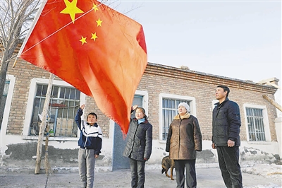 新疆乌鲁木齐永丰乡种牛场一分校的4位师生正在升国旗(1月4日摄)。