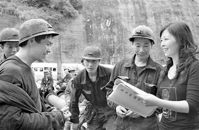 1月11日,四川广安市华蓥山广能集团李子垭煤矿即将下井的矿工,在接受宣传队员每天例行的安全生产提醒和温馨祝福。该矿成立专门的安全生产宣传队、服务队、帮教队,以真情感动矿工时刻注意安全。邱海鹰 摄