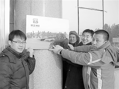 黑龙江农垦工会在新年到来之际,为全垦区各农场职工配齐配全了书屋,仅七星泡农场便一下子购置了46万元的图书。图为职工们正欢欢喜喜地挂牌匾。