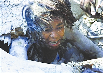 一位被震塌的废墟埋住的女孩焦急地等待救援人员将她救出。肖劼 供图