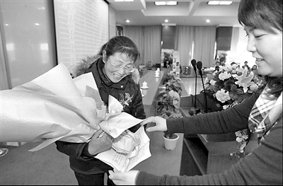 1月14日,在北京中国红十字总会,来自甘肃渭源县的代课老师朱文静刚刚演讲完,工作人员向她献上一束鲜花,以此表达对她十几年坚守三尺讲台的敬意。2008年底,由南方周末报发起,中国红十字基金会支持的“燃烛行动”就已经开始了对代课老师的援助行动,一年时间他们募集资金129万元,通过举办养殖、种植等培训并提供人均4000元的创业资助款,使210名特困代课老师得到帮助。本报记者 杨登峰 摄