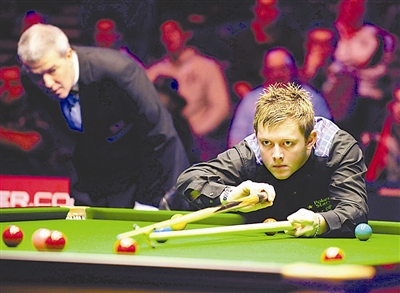 1月13日,马克·艾伦(右)在比赛中。当日,在伦敦举行的斯诺克温布利大师赛中,北爱尔兰选手马克·艾伦以6比3战胜三届世锦赛冠军、苏格兰选手希金斯,进入八强。