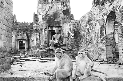 华富里有新城与旧城,两城距离大约四公里。新城看似平常,只不过路灯灯柱上饰以弯弓射箭的勇士形象,大环岛中间供奉纳黎宣大帝铜像,让人怀想纳黎宣大帝当年抗击缅甸侵略、恢复大城王朝的丰功伟绩。车子转入旧城,路旁竖有一个英文、泰文标志牌“猴区当心”。眼前随即便是猴子的世界:一群猴子有的在电线杆上爬上爬下,有的在电线上打秋千,有的接二连三横穿马路。更有几只猴子还翻上小货车,在车箱里翻出果子大嚼大啃,司机下车看看却又无可奈何,只有苦笑作罢。