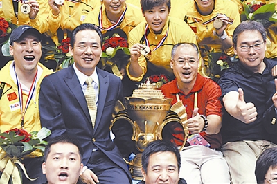 2009年5月17日,苏迪曼杯羽毛球决赛中国队3比0击败韩国队,成功卫冕。中国队赞助商老板李宁(前排右二)和队员们在一起。李宁被公认为运动员创业的成功典范。