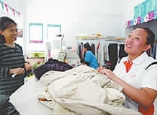 2006年9月4日,由全国妇联“半边天”洗衣工程办公室无偿捐助洗涤设备的伊好洗衣店长春市邹春兰(右)店正式开业。“冠军搓澡工”邹春兰成了邹经理。王江摄