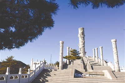 ①云龙山顶峰九龙柱,柱高25.5米,上面雕刻着九条龙和祥云。本报记者许之丰 摄