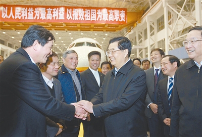 1月14日至17日,中共中央总书记、国家主席、中央军委主席胡锦涛在上海市考察工作。这是胡锦涛在承担大型客机总装任务的中国商飞上海飞机制造有限公司考察时,勉励企业员工发扬科学求实精神,让中国人自主研制的大型客机早日飞上蓝天。新华社记者 鞠鹏 摄