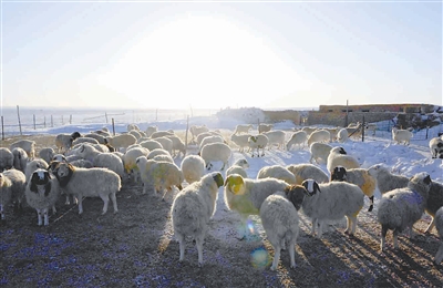 内蒙古锡林郭勒盟正镶白旗境内一处牧民点的羊群在严寒冰雪中等待补饲(1月16日摄)。