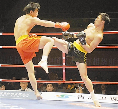 1月17日,河南队张开印(右)在80公斤级比赛中战胜广东队吴浩。当日,在2009中国武术散打超级联赛总决赛中,河南队以4比1战胜广东队,夺得总冠军。
