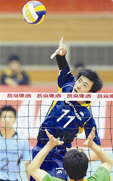 1月17日,上海队球员王清飞(上)在比赛中扣球。当日,在2009-2010赛季全国男排联赛第九轮比赛中,上海队客场以3比0战胜北京队。新华社记者 孔卉 摄