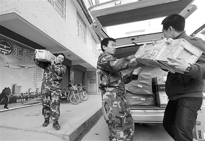 1月14日,复员军人吴建明(右)、张浩源(左)、刘昌中(中)正在忙着搬运顾客邮寄的货物。