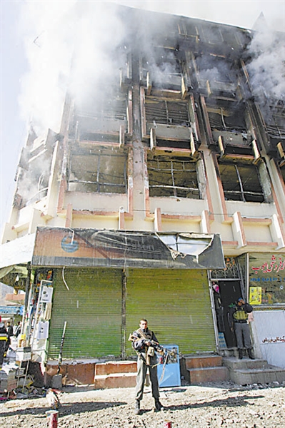1月18日,在阿富汗首都喀布尔,士兵在一座起火的购物中心前守卫。