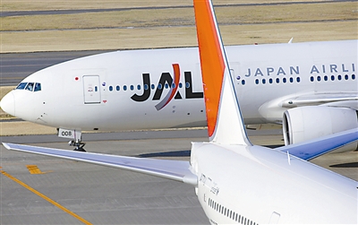 19日,一架日本航空公司的飞机(后)在日本东京羽田机场滑行。新华社/美联