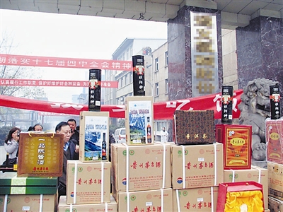 1月19日,遵义一企业职工在街上“晒”厂里的接待品。所“晒”物品包括价格不菲的陈酿茅台、五粮液、习酒等白酒,还有高档茶叶以及高档香烟。据悉,这是厂里的接待品,工人们是在厂领导办公室隔壁储藏间找到的,他们搬出一部分,打算让市民见识见识该厂的公款吃喝风。郭新 摄