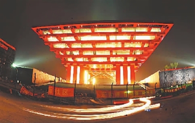 上海世博会中国国家馆在进行灯光调试(2009年12月30日摄)。新华社记者 裴鑫 摄