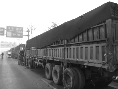 被困的运煤车在高速公路路口排起了长龙。经过一夜冰冻,车身结起了冰凌。车辉 摄