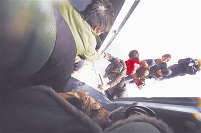 1月23日,一架直升机正在救援搜寻到的被困群众。当日,新疆军区正在阿勒泰参加紧急救援任务的两架直升机再次起飞,为群众运送生活物资、药品和巡诊医护人员。新华社发(李翔 摄)