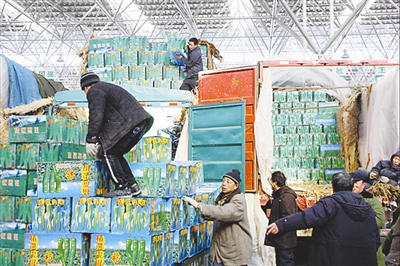 在记者跟张忠岭交谈时,不远处的一辆发往北京的装满新鲜蔬菜的大货车准备出发了。