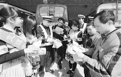 为保春运安全,湖南省新晃侗族自治县公安局交警大队广泛开展“122平安出行”大型交通安全宣传活动,并组织交通安全志愿者深入车站、码头、厂矿、企业、社区、乡镇、商场、家庭等地,给群众送资料,讲平安,以确保春运路畅人安。图为交警与交通安全志愿者在县汽车站发放宣传资料。 罗明媚 摄