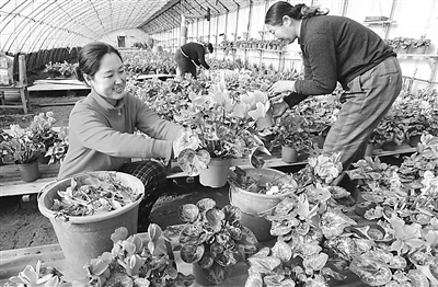 辽宁省锦州市返乡农民工唐慧颖(左),利用创业贷款等惠农政策办花圃,培育仙客来、水仙、杜鹃等花卉获成功,去年销售花卉近万盆,收入10余万元。