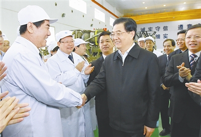 陕西法士特汽车传动集团有限公司和西安西电开关电气有限公司都是有几十年历史的老国有企业,这些年通过自主创新,在同行业中占据了重要地位。在陕西法士特汽车传动集团有限公司的巨大厂房里,胡锦涛察看了齿轮加工、变速器装配和热处理生产线。得知这家企业靠自主研发拥有了20多项专利,去年在国际金融危机冲击的情况下销售收入仍比前年增长20%,总书记称赞这个成绩来之不易,鼓励他们进一步深化企业改革,进一步增强创新能力,始终保持产品技术优势,不断提高企业市场竞争力。在西安西电开关电气有限公司的生产车间,胡锦涛饶有兴致地观看百万伏级全封闭组合电器核心部件的总装过程。总书记对企业员工们说,要实现我国从装备制造大国向装备制造强国的转变,必须坚持走自主创新之路。他希望企业在引进、消化、吸收的基础上不断进行再创新,为振兴我国装备制造业贡献更大力量。