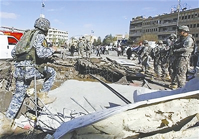 1月26日,伊拉克首都巴格达发生一起汽车炸弹袭击,警察局大楼在爆炸发生后不久倒塌。图为伊拉克安全部队士兵在爆炸现场执勤。吉平 供图