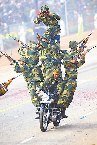1月26日,印度在大雾中迎来了第61个共和国日。印度军队在首都新德里举行了盛大的阅兵式。图为摩托兵表演特技。谢涛 供图