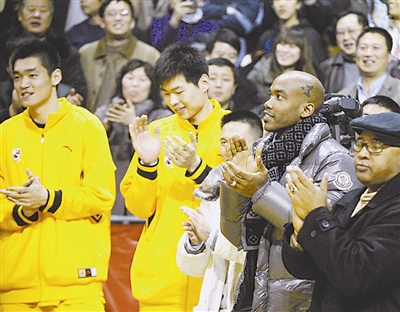 1月27日,马布里(前右二)在山西中宇队取胜后鼓掌祝贺。当日,在CBA第17轮比赛中,山西中宇队主场以113比102战胜青岛双星队。刚刚加盟山西中宇队的NBA前著名球星马布里来到球场观战。