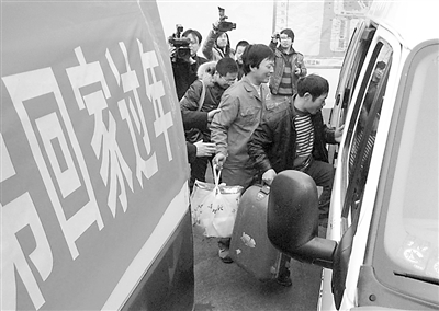 1月28日,几位农民工登上公司准备的专车,去往火车站。